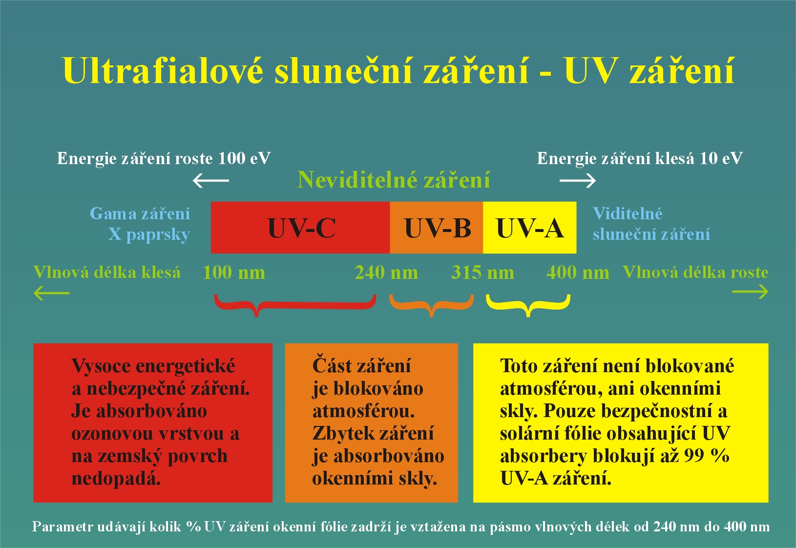 Ultrafialové záření. Zdrojem ultrafialového záření jsou tělesa s vysokou teplotou (slunce, další hvězdy nebo elektrický oblouk) nebo speciální výbojky (výbojka plněná párami rtuti, která se používá jako horské slunce). Neprochází obyčejným sklem, proto je nutné při výrobě speciálních výbojek používat zvláštní druh skla - tzv. křemenné sklo.