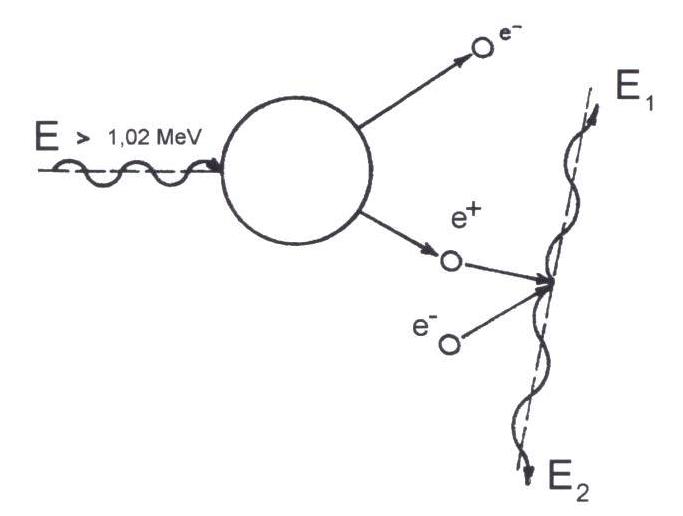 Tvorba elektron-pozitronových párůTvorba elektron-pozitronových párů se uplatňuje při vysokých energiích záření γ a u absorpčních materiálů s vysokým protonovým číslem. Dochází k tomu, že v blízkosti atomového jádra nebo jiné částice se energie elektromagnetického záření zcela přemění na částice elektron a pozitron s kinetickými energiemi Ee a Ep. Přítomnost jádra nebo třetí částice je nutná k převzetí části hybnosti fotonu, protože součet hybností vzniklého páru elektron-pozitron je menší. K tomuto typu interakce je nezbytné, aby energie fotonu záření γ byla větší než energie odpovídající dvěma klidovým hmotnostem elektronu, tedy větší než 2 . 0,51 MeV = 1,02 MeV. Prakticky však dochází k tomuto typu interakce až při energiích značně vyšších. Vzniklé částice ( elektron a pozitron) ztrácejí pak dále svou kinetickou energii ionizací a excitací atomu prostředí. Když pozitron sníží svou energii až na hodnoty odpovídající rychlostem tepelného pohybu, spojí se s libovolným elektronem, přičemž se jejich hmotnost přemění na energii elektromagnetického záření. Nejčastěji vznikají dvě kvanta záření, každé o energii 0,51 MeV, odpovídající energetickému ekvivalentu klidové hmotnosti elektronu. Tato kvanta se pohybují vzájemně opačným směrem. Doba života pozitronu je kolem 10-7 s.