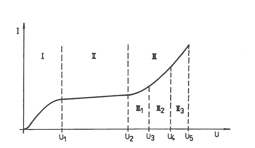 • oblast Ohmova zákona (I) - ionty vzniklé primární ionizací spolu rekombinují, rekombinace klesá s rostoucím napětím, a tím roste ionizační proud úměrně s napětím; pracovní napětí je příliš nízké a sběr iontů nedokonalý, této oblasti se k detekci ionizujícího záření neužívá;