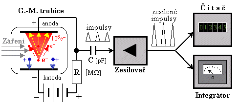 Schématické znázornění Geiger-Müllerova počítače