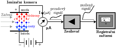 Schematické znázornění principu ionizační komory pro detekci toku ionizujícího záření