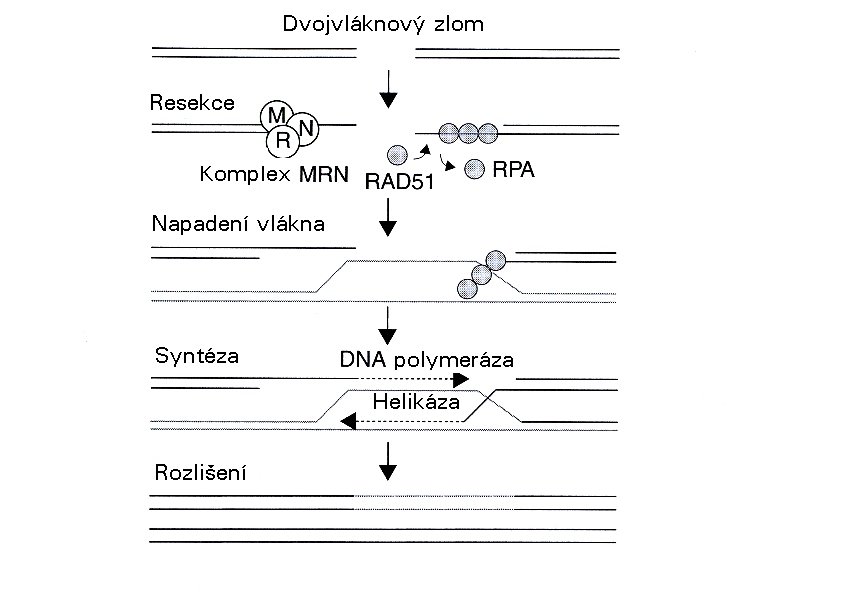 Dvojný zlom je nejen poškození, jehož rozpoznání je relativně dobře známo. Byl též jedním z nejstudovanějších ve smyslu opravy. Hlavní cesty byly podrobně popsány během posledních 10 či 15 let - homologní rekombinace (HR) a nehomologní připojení konců (non-homologous end-joining (NHEJ)). Jak lze odvodit z názvu, je homologní rekombinace proces, ve kterém se opravuje poškození úseku DNA s použitím informace o nepoškozeném homologním úseku DNA, obvykle na sesterském chromatidu. Protože dvojný zlom není téměř nikdy „čistým" zlomem dvou řetězců DNA, které mohou být jednoduše opět spojeny, je třeba konce na obou stranách nejprve připravit pro další postup. Výše zmíněný MRN komplex částečně natráví tyto konce a vytvoří a vytvoří spojení připomínající řetězce, které jsou potom potaženy speciálními proteiny. Tento komplex DNA-protein napadá homologní úsek DNA a nalézá příslušnou oblast pro čtení informace, která byla ztracena během zlomů a natrávení. Pro tento složitý krok se ovšem vyžaduje řada dalších proteinů, z nichž jeden je helikáza, enzym, který rozvíjí dvojitý řetězec. Poté DNA polymerázy kopírují potřebnou informaci ze dvou nepoškozených řetězců homologní DNA a vše se vrací ke svému normálnímu stavu pomocí dalších proteinů. Homologní rekombinace obvykle požaduje dostupnost sesterského chromatidu, a proto je možná pouze v (pozdních) S a G2 fázích buněčného cyklu. V G1 fázi by bylo v principu možno pro stejný účel použít informaci o homologním chromozomu, avšak zdá se, že to není příliš běžné. Proto většina buněk vykazuje vzrůstající radiorezistenci při postupu z G1 do S a dále během S-fází, s maximem v pozdní S-fázi. V G2 se stávají opět citlivějšími tak, jak je k dokončení opravy k dispozici stále méně času.