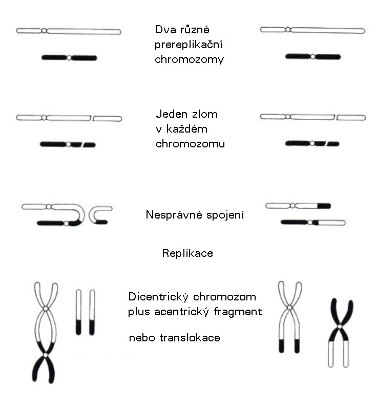 Chromozomové aberace způsobené nesprávnou opravou dvojných zlomů různých chromozomů (modifikováno podle Hall (2000) obr. 2.6) Proces účastnící se tvorby jednoho či druhého typu chromozomálních aberací (strukturní abnormality na úrovni chromozomu) není dosud zcela vysvětlen, avšak je zde jasný důkaz existence všech těchto procesů. Poměr špatně spárovaných a úspěšně opravených dvojných zlomů závisí na mnoha faktorech, jako je typ buňky, stádium buněčného cyklu, kvalita záření a dávka. Obvykle je ten poměr řádu 1.10-5 na buňku na mGy. Protože očekáváme 4.10-2 dvojných zlomů na buňku na mGy (40 na buňku na Gy), je zřejmé, že je více než 99,9 % všech těchto zlomů úspěšně opraveno. Četnost úspěchu je dokonce ještě vyšší pro opravu jednoduchých zlomů a poškození bází. Bodové mutace (vypuštění, vložení nebo výměny jednotlivých bází) se vyskytují s podobnou frekvencí jako chromozomové aberace po ionizujícím záření, to jest zhruba 5.10-6 na buňku na mGy. Některé z nich ovšem pocházejí z chyb provedených během HR dvojných zlomů, tak že tato hodnota nám poskytuje maximální frekvenci chyb, které by bylo možno přisoudit opravě jednoduchých zlomů a modifikací bází. Při zhruba jednom z těchto dvou typů poškození na buňku na mGy (1 000 na buňku na Gy) to znamená četnost úspěchu lepší než 99,999 %. To je též konzistentní s měřeními přesnosti in vitro, se kterou polymerázy vkládají nové nukleotidy a s přesností, se kterou jsou chybně vložené nukleotidy rozpoznány a buď odstraněny ihned během procesu opravy („proof-reading") nebo opraveny později („mismatch repair"). Na tomto místě je opět vhodné připomenout statistickou povahu všech dosud popsaných procesů. Ionizace nenastává, pokud je energie přicházejícího fotonu nebo částice nedostatečná. Pokud je energie dostatečná, existuje pravděpodobnost tvorby radikálů, které s určitou pravděpodobností povedou k poškození DNA. Toto poškození nebude nikdy opraveno se 100% četností úspěchu, takže jakákoli ionizace může vést k chromozomovým aberacím nebo bodové mutaci s určitou pravděpodobností. To vše jsou důležité skutečnosti, které je třeba uvažovat při diskusi účinků malých dávek záření.