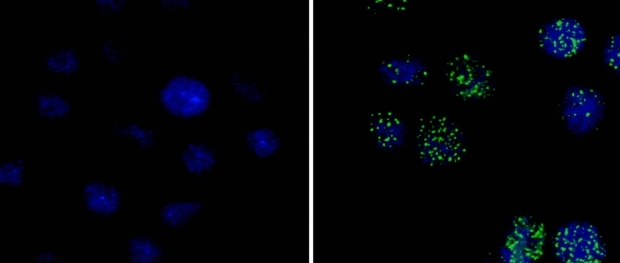 Označení buněk protilátkami specifickými pro γH2AX bez ozáření (nalevo) a po ozáření 5 Gy (napravo)