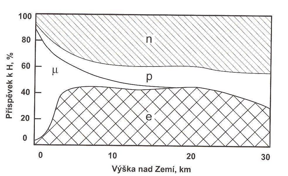 Vznik sekundárního kosmického záření. Jak je vidět na obrázku, k dávkovému ekvivalentu člověka na zemském povrchu přispívají nejvíce muony, s rostoucí nadmořskou výškou roste příspěvek elektronů, ve vzdálenostech větších než desítky kilometrů nejvíce dominují protony. Na radiační zátěži člověka v obvyklých výškách letů letadel se podílí polovinou neutrony a polovinou nabité částice.