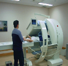 Jednofotonová emisní výpočetní tomografie (SPECT)SPECT je zobrazovací metoda, která dokáže zobrazit prostorové rozložení radiofarmaka v lidském těle. Gantry umožňuje pohyb detektoru kolem těla pacienta v malých úhlových krocích, případně jsou přístroje vybavovány zařízením, které automaticky udržuje optimální vzdálenost detektoru od povrchu těla pacienta. Při vyšetření se otáčením jednoho až tří detektorů kolem těla pacienta zhotovuje velké množství projekcí. Získaná data jsou uchována v paměti počítače pro další zpracování a rekonstrukci obrazů ve třech základních vzájemně kolmých rovinách - transversální, frontální a sagitální. Na rozdíl od rentgenových metod, které zobrazují tělní struktury, se tato metoda soustředí na zobrazení funkce daných orgánů.