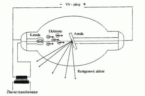 RentgenkaZdrojem rentgenového záření je rentgenka, což je skleněná, evakuovaná trubice (Coolidgeova lampa). Ve vzduchoprázdném prostoru trubice je zabudována žhavená katoda (ve formě spirály) a anoda. Ta má u rentgenek s pevnou anodou tvar terčíku a u rotačních anod tvar talíře. Katoda a anoda jsou z wolframu. Wolfram je kov o vysokém protonovém čísle a vysokém bodu tání, snáší teploty až do 3 000 oC a hodí se také k brždění prudce letících elektronů. Vložíme-li mezi katodu a anodu napětí desítek až stovek kV, vylétnou elektrony z katody a dopadnou prudce na anodu. Více než 99 % kinetické energie elektronů se změní v teplo a méně než 1 % v rentgenové záření brzdné a charakteristické.