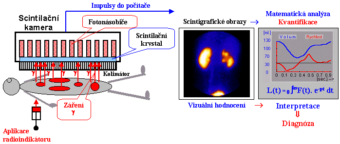 Planární scintigrafiePo aplikaci radioindikátoru dochází k jeho distribuci v určitých částech organismu, tuto distribuci pomocí zevní detekce vycházejícího záření γ zobrazujeme scintilační kamerou , v počítači vznikají digitální scintigrafické obrazy, které jednak hodnotíme vizuálně, jednak můžeme pomocí křivek matematicky analyzovat vyšetřované procesy a počítat kvantitativní parametry funkce jednotlivých orgánů.