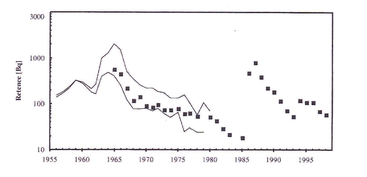 Časový průběh retence 137Cs u českého obyvatelstva. Čarou jsou znázorněny maximální a minimální obsahy 137Cs v průměrném jedinci v evropských zemích, kostky znázorňují průměrné hodnoty.