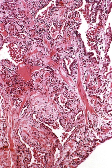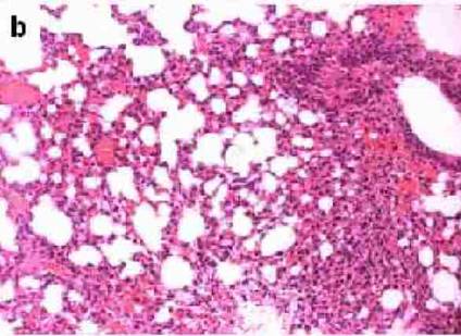 Plicní fibróza. Radiační pneumonitida je definována jako exsudativní zánět vznikající jako následek ionizujícího ozáření a je považována za alveolitis z poškození pneumocytů a endoteliálních buněk. Poškození se manifestuje obvykle za 4 - 6 měsíců po ozáření plic jednorázovou dávkou 8 Gy a vyšší. Jedná se o změny v ozářených oblastech a jsou tedy ohraničené. Radiační pneumonitida se klinicky projevuje pod obrazem nehnisavého exsudativního zánětu, tj. dušností, neproduktivním kašlem, teplotou a pleuritickou bolestí. Objektivně se u sledovaných pacientů zjišťuje přítomnost chrůpků a horečky. V případě dekompenzace nemoci se rozvíjí akutní respirační nedostatečnost nebo akutní cor pulmonale. Při histologickém vyšetření v manifestační fázi jsou popisovány intersticiální až intraalveolární edém, zánětlivá infiltrace alveolů, zmnožení makrofágů a zvýšená buněčnost vazivové tkáně. Prognóza nemoci záleží především na léčbě, ale i při použití současných léčebných možností umírá asi čtvrtina až polovina všech nemocných. Radiační fibróza plic, tj. zmnožení fibrózní plicní tkáně, je konečným stádiem postradiačních plicních změn. Radiační fibróza plic je syndromem, který se objevuje po ozáření plicní tkáně ionizujícím zářením až po 30 týdnech a jako u radiační pneumonitidy po dávkách větších než 8 Gy. Ionizujícím zářením způsobené nekrotické změny jsou hojeny fibrotickou jizvou. Avšak proces hojení u ozářených tkání není stejný jako u konvenčních poranění, nýbrž je aktivován i několik let a fibrotické jizvy reprezentují nepravidelně uspořádaná kolagenní vlákna.