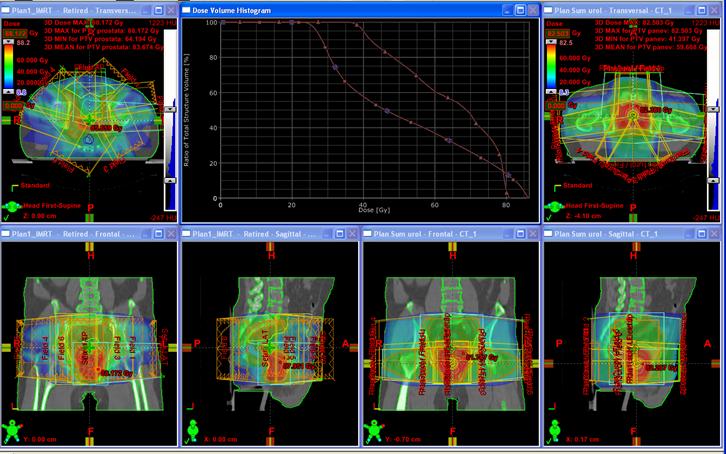 Ozařovací plán pro radioterapii v oblasti pánve. Distribuce dávky je znázorněna různými barvami. Graf ve středu obrázku je histogram dávka - objem (DVH; dose-volume histogram).