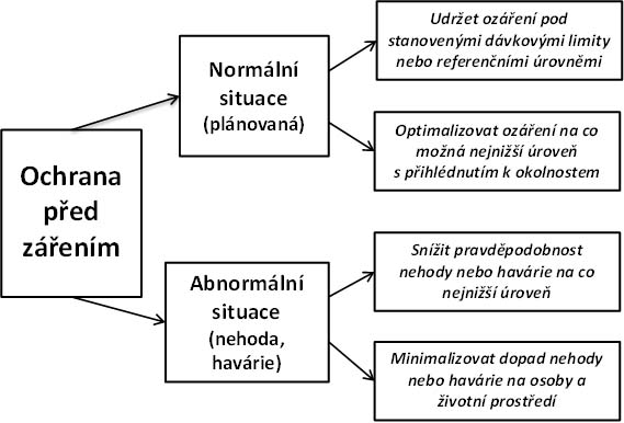 Ve všech oblastech ochrany před zářením mají značnou váhu zejména doporučení ICRP, která všude ve světě slouží jako základ při rozhodování dozorných a legislativních orgánů. Komise ICRP za dobu své existence od roku 1928 vydala celou řadu materiálů, z nichž zásadní roli v ochraně před zářením sehrály její souhrnná doporučení, zejména pak doporučení z roku 1977 (ICRP 26), doporučení publikované v roce 1990 (ICRP 60) a pak poslední doporučení ICRP 103 z r. 2007. Podnětem pro doporučení ICRP 60 byly nejnovější informace z epidemiologických studií obyvatelstva Hirošimy a Nagasaki, které ukázaly, že riziko rakoviny vyvolané zářením je třikrát až čtyřikrát větší, než se předpokládalo v roce 1977. Mimoto, komise ICRP rozšířila koncepční rámec doporučení z roku 1977 tím, že vyjasnila svůj postoj v situacích, kdy existuje určitá pravděpodobnost ozáření, ale není jisté, zda k tomu opravdu dojde (potenciální ozáření), a tím, že definovala zásady ochrany zaměřené na snížení dávky v situacích, kdy zdroj záření není pod kontrolou (intervence). Podle nově prosazovaného přístupu koncepce zdravotní újmy se nyní tento pojem vztahuje ke kombinaci fatální i nefatální rakoviny i rovněž tak k vážným dědičným poruchám, přičemž každý z těchto jevů je vážen svou relativní závažností a věkem, kdy k němu během života dojde. Systém ochrany při jakékoli činnosti, při které se ozáření člověka zvyšuje, vychází - podobně jako dříve - z těchto obecných zásad: oprávněnost dané činnosti, optimalizace ochrany a limitování dávek. V souladu se základním doporučením ICRP lze hlavní principy ochrany před zářením shrnout následujícím způsobem: a) Zdůvodnění činnosti: žádná činnost vedoucí k ozáření nesmí být uskutečněna, nepovede-li k dostatečnému přínosu pro ozářeného jednotlivce nebo společnost, který by vyvážil újmu vyvolanou zářením. b) Optimalizace ochrany před zářením: ve vztahu k jakémukoli používanému zdroji, velikost jednotlivých dávek, počet ozářených osob, jakož i pravděpodobnost ozáření, musí být udržovány na tak nízkých úrovních, jak lze z hledisek ekonomických a sociálních rozumně dosáhnout. c) Limitování dávek a rizika: ozáření jednotlivců pocházející z kombinace všech relevantních činností jsou podrobeny dávkovým limitům nebo určité specifické kontrole rizika v případě, že se jedná o potenciální expozice. Tato opatření jsou zaměřena na zajištění takového stupně ochrany, aby žádná osoba nebyla vystavena takovému ozáření, které by za normálních podmínek bylo považováno za nepřijatelné v dané situaci. d) Zabezpečení zdrojů záření: zajištění zdrojů před nepovolanými osobami. Za normálních pracovních a provozních podmínek lze přísné bezpečnostní požadavky, doporučené mezinárodními expertními skupinami a organizacemi a předepsané legislativou jednotlivých států, nejenom splnit, ale zajistit mnohem vyšší ochranu pracovníků i obyvatel, než je zakotvena v příslušných zákonech či vyhláškách. Poněkud jiná je situace v případě jaderných nebo radiačních nehod, případně jiných havarijních radiologických událostí. K takovým okolnostem dochází však jen velmi zřídka a v současné době jsme na řešení těchto mimořádných situací dostatečně připraveni. Jsou rozpracovány do nejmenších podrobností scénáře nehod nebo havárií a k tomu jsou k dispozici havarijní plány a postupy, které představují optimální vodítko ke zmírnění nebo úplné eliminaci vlivu těchto událostí na zasahující týmy, pracovníky i okolní obyvatelstvo. Zatímco v drtivé většině lze předvídat průběh možných havárií spojených s únikem radioaktivních látek do životního prostředí a čelit jim s cílem minimalizovat jejich radiační důsledky, zásadně jiná je situace, pokud se jedná o cílené zneužití radioaktivních zdrojů nebo jaderných zařízení pro zlovolné nebo teroristické cíle. Řešení takové události je mnohem komplikovanější, neboť obvykle nejsou okamžitě k dispozici veškeré potřebné informace o závažnosti, charakteru a rozsahu radioaktivního zamoření. K tomu je nutno použít nejenom běžnou monitorovací techniku, ale i speciální měřicí zařízení, která umožní získat požadované bližší údaje o nebezpečí, které zamořené prostředí představuje pro zásahové jednotky nebo další osoby. V tomto směru má dálkově řízený monitor úrovně záření a radioaktivní kontaminace nezastupitelnou funkci. Jeho použití může nejenom radikálně snížit obdržené dávky nasazeného personálu, ale optimalizovat způsob řešení dané radiologické havarijní situace s ohledem na minimalizaci jejího vlivu na okolní životní prostředí. Obecně na radiační ochranu je třeba se dívat ze dvou zorných úhlů: a) situace je normální, tj. v souladu s tím, co v daném případě očekáváme (v tomto případě je ozáření na velmi nízké úrovni); nebo b) situace je v důsledku nehod nebo jiných okolností abnormální, kde musíme počítat s ozářením nad rámec příslušných dávkových úrovní stanovených pro normální situace. Cíle radiační ochrany lze formulovat jako systém zajištění adekvátní ochrany před škodlivými účinky ionizujícího záření, přičemž za rozhodující se považují dva úkoly: a) Zajistit, aby ozáření za normálních okolností (vše je pod kontrolou) bylo co nejmenší a bylo optimalizováno s ohledem na přínos a újmu, přičemž se současně přihlíží k dalším relevantním aspektům včetně existujících prostředků. b) Snížit pravděpodobnost nehody nebo jiné mimořádné situace, která by 