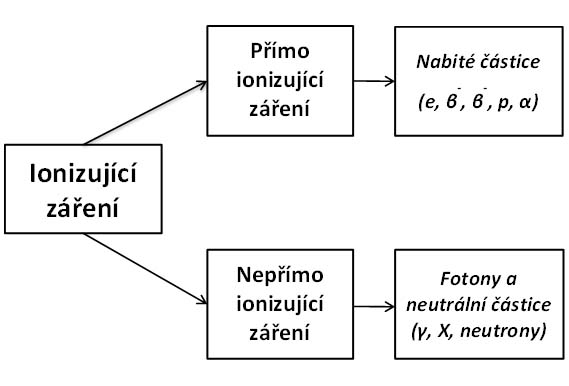 U ionizujícího záření rozeznáváme jeho dva druhy, a to přímo ionizující záření a nepřímo ionizující záření. Mezi přímo ionizující záření řadíme nabité částice, zatímco nepřímo ionizující záření zahrnuje fotony a neutrální částice (obr. 2). Hlavní rozdíl mezi přímo ionizujícím a nepřímo ionizujícím zářením je ve způsobu, jakým je jejich energie v dané látce deponována. V prvním případě se jedná o bezprostřední absorpci nabitých částic v prostředí, kterým se pohybují, zatímco v případě nepřímo ionizujícího záření se primární energie tohoto záření nejdříve vynaloží na produkci nabitých částic, jejichž energie je potom v uvažované látce absorbována.
