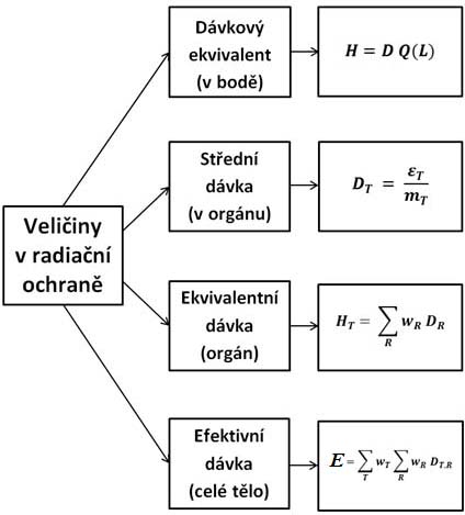 Přehled veličin, včetně jejich definičních vztahů, používaných v radiační ochraně pro kvantifikaci stochastických biologických účinků je ilustrován na obr. 12. Tyto veličiny vycházejí v zásadě z koncepce dávky v určitém bodě ve tkáni, který je potom rozšířen na dávkový ekvivalent v bodě a na střední dávku ve tkáni nebo orgánu. Na základě střední dávky jsou potom definovány veličiny ekvivalentní dávka HTa efektivní dávka E, což jsou v radiační ochraně nejdůležitější veličiny, neboť právě v těchto veličinách jsou udány dávkové limity.