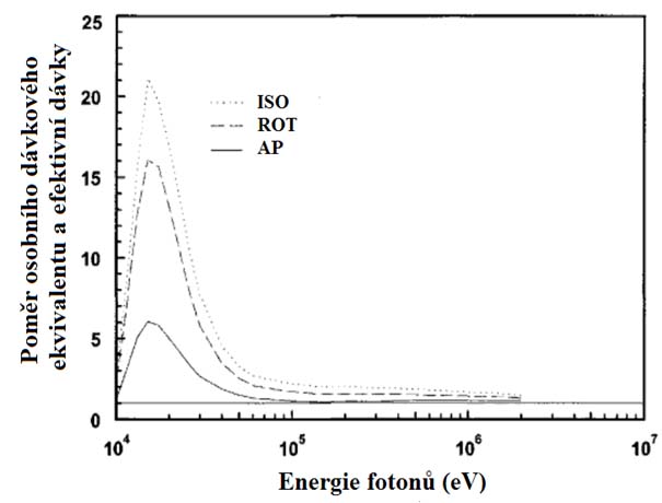 Obr. 16. Poměr osobního dávkového ekvivalentu Hp(10) a efektivní dávky E jako funkce energie fotonů pro různé geometrie (ISO - izotropní, ROT - rotační, AP - předozadní)