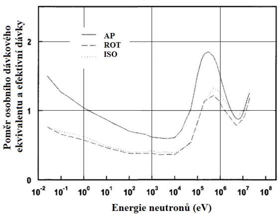 Obr. 17. Poměr osobního dávkového ekvivalentu Hp(10) a efektivní dávky E jako funkce energie neutronů pro různé geometrie (ISO - izotropní, ROT - rotační, AP - předozadní)