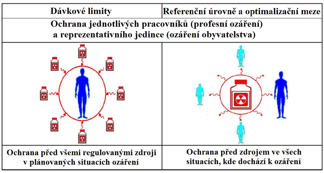 Cílem radiační ochrany, jak již bylo zmíněno výše, je minimalizovat možnost ohrožení osob deterministickými účinky a snížit na přijatelnou úroveň riziko stochastických účinků. K realizaci těchto záměrů slouží propracovaný systém příslušných organizačních a technických opatření, které mají dostatečnou oporu v legislativě, jež dává orgánům státní správy dostatečné pravomoci k tomu, aby mohly zabezpečit požadovanou úroveň radiační ochrany. V současné době stojí radiační ochrana v zásadě na čtyřech pilířích, které představují základní principy zabezpečení ochrany před ionizujícím zářením: zdůvodnění aplikace radiačních a jaderných technologií (aplikace musí přinést více užitku než škody), limitování ozáření (v normálních situacích, s výjimkou lékařských aplikací, by ozáření nemělo překročit stanovené dávkové limity), optimalizace ozáření (ozáření musí být nejenom pod úrovněmi příslušných dávkových limitů, ale pokud možno, s ohledem na ekonomická a společenská hlediska, tak nízké, jak je rozumně dosažitelné), a odpovídající zabezpečení zdrojů záření (obr. 31). Posledně uváděný požadavek je akcentován teprve v posledním desetiletí, kde vyvstala potenciální možnost hrozby zneužití vysoce aktivních radioaktivních zářičů pro teroristické a jiné zlovolné akce. Zjednodušeně řečeno, zatímco dříve bylo naší hlavní snahou chránit člověka před ozářením zdroji záření, dnes k tomu přistupuje i požadavek zajistit, aby se těchto zdrojů nemohly zmocnit neoprávněné osoby.