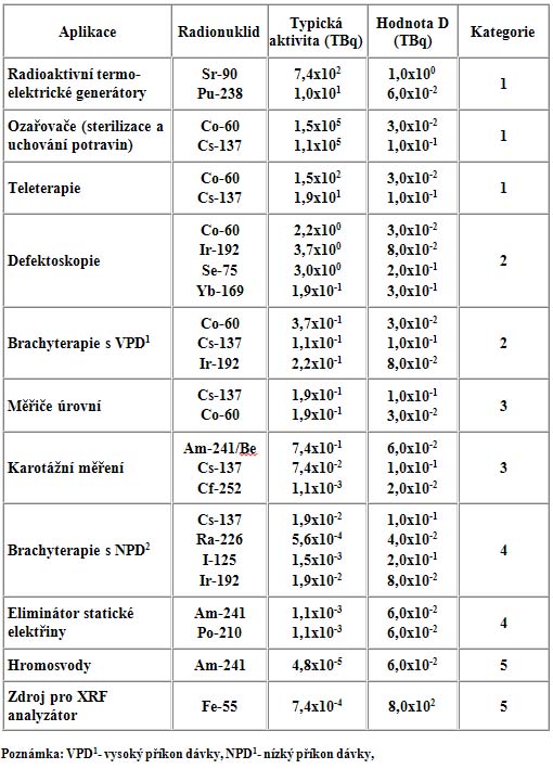 V poslední době věnuje IAEA mimořádnou pozornost zajištění bezpečnosti silných radioaktivních zářičů, kde je odůvodněná hrozba jejich možného použití pro teroristické útoky. Za tímto účelem rozpracovala IAEA systém kategorizace radioaktivních zdrojů podle stupně jejich nebezpečnosti (obr. 44). V souladu s tímto systémem byly zdroje rozděleny do pěti kategorií, od těch nejnebezpečnějších, používaných v radioaktivních termoelektrických generátorech a průmyslových ozařovačích (kategorie 1), až po méně nebezpečné, které se využívají v takových aplikacích, jako jsou rentgen-fluorescenční analyzátory nebo hromosvody (kategorie 5).