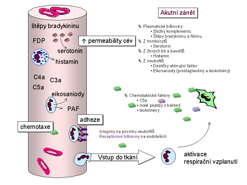 Obranné mechanizmy nastupují rychle. Nejprve se mobilizují neutrofilní granulocyty, které jsou schopny fagocytovat cizí elementy, uvolňují se substance zvyšující neutrofilní leukocyty v krvi, které pak dosahují k zánětlivé oblasti marginací, diapedezí a chemotaxí. Progresivně se zvyšuje počet neutrofilních granulocytů a produkce monocytů v kostní dřeni.
