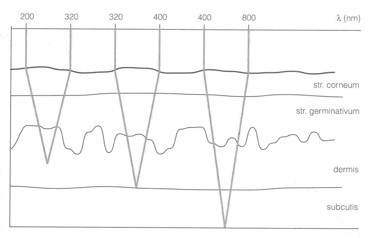 Hloubka průniku světla do kůže v závislosti na vlnové délce