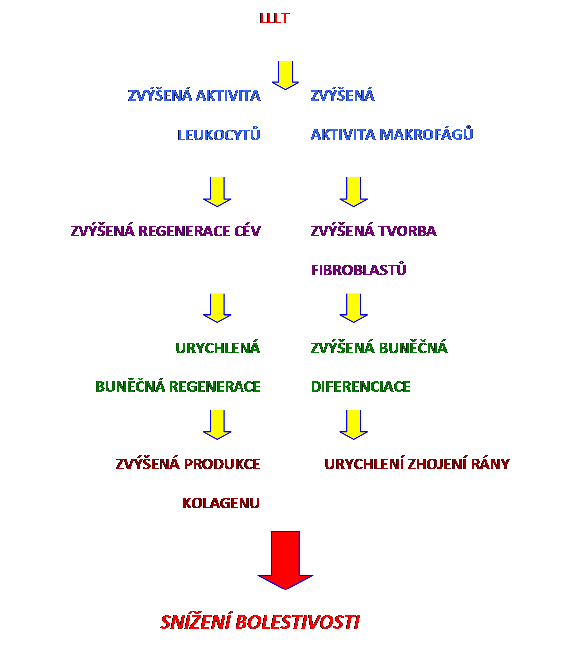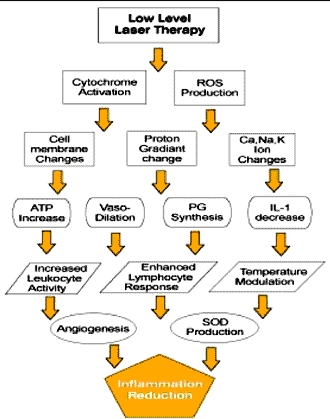 Účinek terapeutického laseru na celulární úrovniMechanismus biologických účinků nízkovýkonných laserů je ověřován in vitro i in vivo. Je popisován stimulační, protizánětlivý i analgetický efekt. Stimulační efekt aktivuje enzymy dýchacího řetězce (flavin dehydrogenázu, cytochromoxidázu) v mitochondriích. Enzymy se účastní oxidační reakce (přenos elektronu ze substrátů na kyslík), jejímž výsledkem je tvorba ATP. Zvýšená koncentrace ATP, ADP a AMP, při laserem navozeném stimulačním efektu, vede k replikaci mitochondriální DNA. Výsledkem je urychlená epitelizace postižené tkáně a stimulace tvorby kolagenu. Při protizánětlivém účinku nízkovýkonný laser aktivuje přirozené reparační procesy, kterými organismus reaguje na probíhající zánět. Zvyšuje se chemotaktická aktivita buněk (lymfocytů, monocytů, fibroblastů a polymorfonukleárních buněk), které se na protizánětlivé reakci organismu podílí.