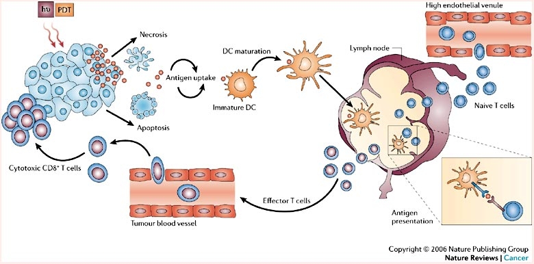 Fotodynamická terapie (PDT) je vedle chemoterapie, radioterapie a imunoterapie jednou z možností léčby nádorového onemocnění. Je to druh fotochemoterapie, který kromě světla a aplikované látky - fotosensitizátoru, vyžaduje také přítomnost kyslíku. PDT je založena na principu selektivní akumulace fotosensibilizující látky v nádoru a následném ozáření tumoru světelnou energií vhodné vlnové délky. Vlivem absorpce světla dochází ve fotosensitizátoru ke vzniku excitovaných stavů, které v zásadě podléhají dvěma typům deaktivačních reakcí. Buď excitovaná forma fotosensitizátoru reaguje přímo se substrátem za vzniku volných radikálů substrátu nebo dochází k transferu energie z fotosensitizátoru na kyslík a ke vzniku vysoce reaktivní singletové formy kyslíku. Volné radikály, zvláště pak radikály lipidických složek buněčných membrán, jsou příčinou destrukce nádoru. Výsledným terapeutickým efektem je nekróza, současně s apoptózou nádorových buněk.