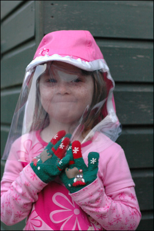 Dítě nemocné xeroderma pigmentosum v ochranném oděvu proti slunečnímu UV záření