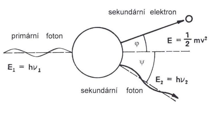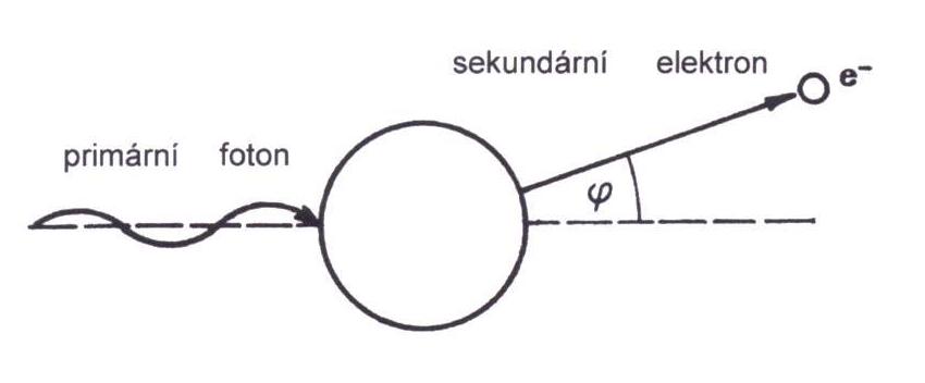Comptonův rozptylJe to interakce fotonů gama záření s volnými nebo jen velmi slabě vázanými elektrony (na rozdíl od fotoefektu, kde se jedná o interakci fotonu s pevně vázaným elektronem). Foton gama záření předá část své energie volnému elektronu a posune ho. Rozptýlený foton pak s nižší energií (tj. větší vlnovou délkou) pokračuje v pohybu v odlišném směru. Rozptyl sekundárních fotonů kolísá v intervalu 0° až 180° a jejich energie je závislá na úhlu rozptylu. Comptonův rozptyl je převládajícím typem interakce gama záření středních energií s látkami s malým protonovým číslem. Pro úhel ψ = 180°, tedy pro zpětný rozptyl, je pokles energie primárního fotonu největší. Děj se může několikrát opakovat, až foton ztratí tolik energie, že převládne pravděpodobnost jeho zániku fotoelektrickým jevem.