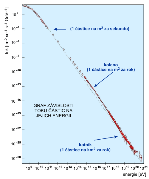 Vznik sekundárního kosmického záření. Jak je vidět na obrázku, k dávkovému ekvivalentu člověka na zemském povrchu přispívají nejvíce muony, s rostoucí nadmořskou výškou roste příspěvek elektronů, ve vzdálenostech větších než desítky kilometrů nejvíce dominují protony. Na radiační zátěži člověka v obvyklých výškách letů letadel se podílí polovinou neutrony a polovinou nabité částice.