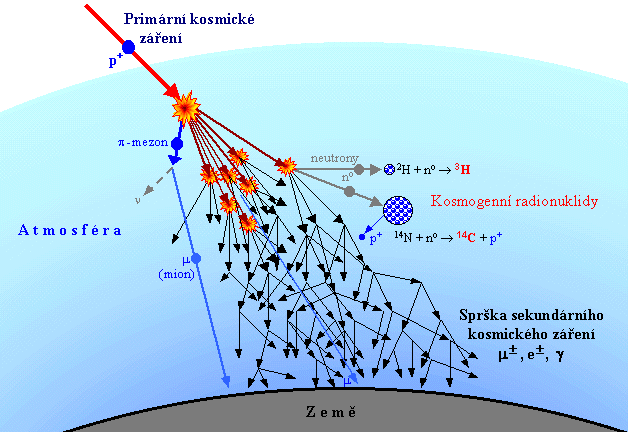 Radiační Van Allenovy pásy. Po vstupu do atmosféry interagují částice kosmického záření s přítomnými atomy a molekulami. Zatímco těžší jádra pronikají jen do zcela vnějších vrstev, částice vznikající interakcemi zejména primárních fotonů pronikají až k zemskému povrchu (tzv. sekundární složka kosmického záření).