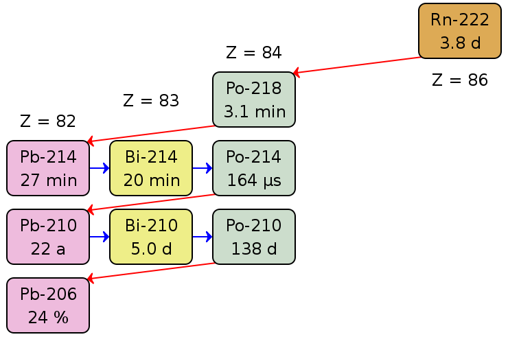 Samotný radon není pro člověka příliš nebezpečný, protože po vdechnutí je opět vydechnut ven. Významné z hlediska ozáření jsou jeho dceřiné produkty, mezi které patří polonium 218Po (poločas přeměny 3,1 minuty), olovo 214Pb (poločas přeměny 27 minut), vizmut 214Bi (poločas přeměny 20 minut) a polonium 214Po (poločas přeměny 164 μs). Ten se přeměňuje na izotop olova 210Pb s poločasem 22 let. Všechny tyto rozpadové produkty jsou kovy, které se v atmosféře usazují na povrchu prachových částic. Společně s nimi jsou pak vdechovány a podle velikosti se mohou deponovat v různých částech na výstelce dýchacích cest nebo plic. Vzhledem k vysoké toxicitě α částic jsou nejškodlivější oba izotopy polonia, které se rozpadají tímto způsobem.