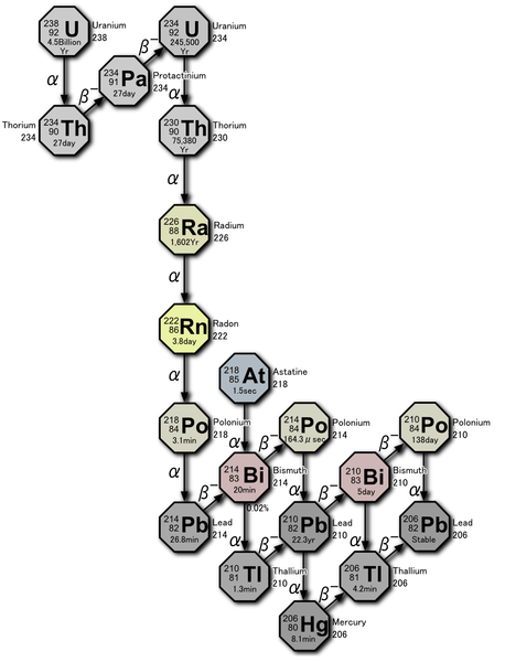 Z radionuklidů vznikajících v přeměnových řadách je nejvýznamnější radium 226Ra (je v řadě počínající uranem 238U) a z něho vznikající plyn radon 222Rn s řadou dceřiných produktů, které jsou již v pevné formě.