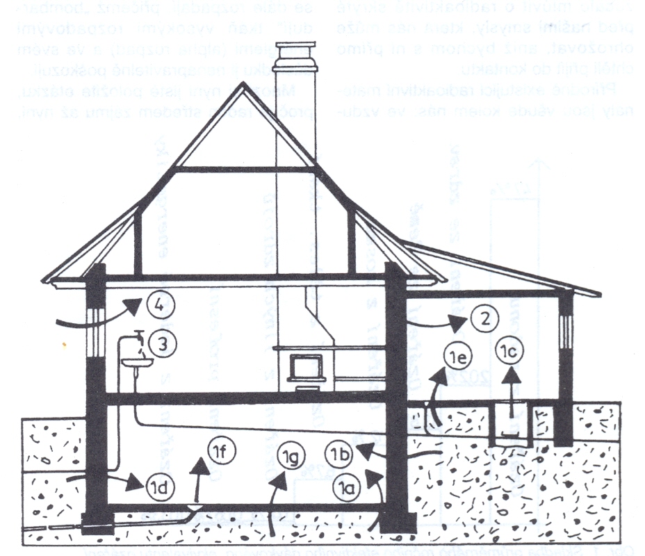 1(a - g) - podloží pod objektem; radon proniká z půdního vzduchu do interiéru difuzí nebo se v důsledku podtlaku nasává např. trhlinami mezi stěnou a podlahou (1a), trhlinami způsobenými rozdílným sedáním v suterénních stěnách, příp. v základové desce (1b), netěsnostmi kolem uzávěrů revizních šachet (1c), netěsnostmi kolem prostupů instalací (1d), netěsnostmi kolem podlahových vpustí (1e) nebo odvodňovacím drenážním potrubím - trativodem (1f). Možným transportním mechanizmem je i difuze konstrukcemi spodní stavby (1g);
