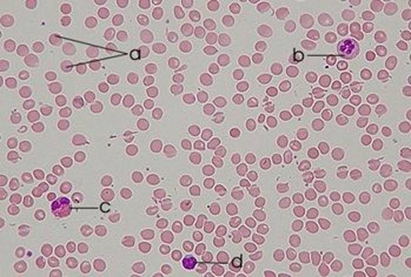 Fyziologický krevní nátěr (a - erytrocyty; b- neutrofil, c - eozinofil, d - lymfocyt).