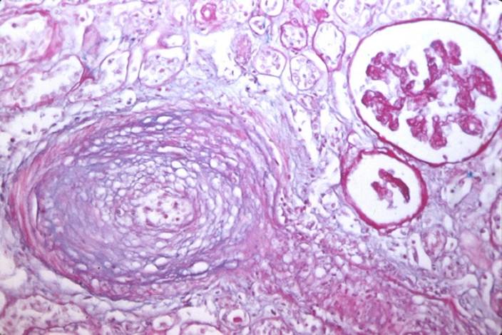 Postižení drobných arterií: časné změny jsou mnohem méně vyznačeny, neboť arterie jsou relativně rigidní struktury. Nicméně, v průběhu času se rozvíjí evidentní poškození endotelu a médie. Jde zejména o fragmentaci a porušení membrana elastica interna, degenerativní změny buněk hladké svaloviny médie a její hyalinizace, fibrotizaceadventicie, která přechází do intersticia.
