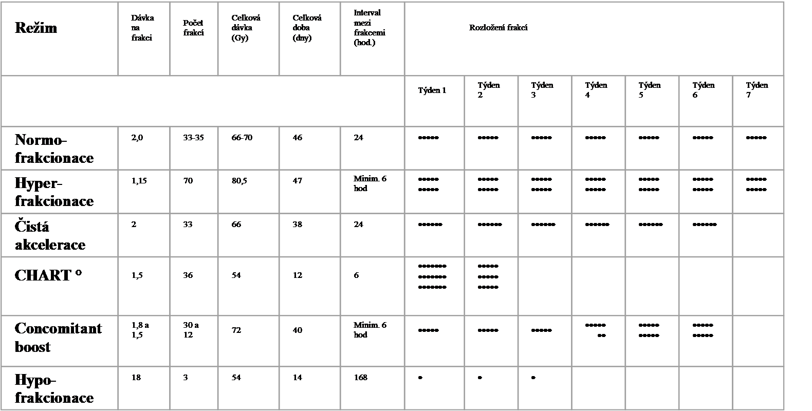 Tabulka - Typy frakcionačních režimů. ° Continuous hyperfractionated accelerated radiotherapy Radiobiologickým podkladem alternativních frakcionací jsou odlišné charakteristiky nádorové a zdravé tkáně z hlediska vlastní radiosenzitivity buněk (dané jejich schopností reparovat poškození způsobená ozářením), rychlosti růstu a růstové fázi buněk, oxygenace a schopnosti akcelerované repopulace kmenových buněk. V praxi se tyto režimy využívají v následujících situacích:
