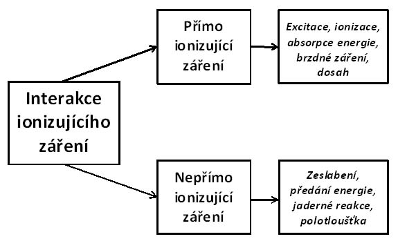Při průchodu látkou ionizující záření interaguje s okolními atomy a jádry daného prostředí různými procesy, které závisí na druhu záření, jeho energii a na složení látky. Z hlediska povahy interakce je na místě uvažovat zvlášť přímo ionizující záření a nepřímo ionizující záření. Zatímco první druh záření ztrácí svou energii více méně kontinuálně a tedy vykazuje určitý dosah, u nepřímo ionizujícího záření nelze mluvit o dosahu, neboť jeho jednotlivé částice (např. kvanta gama nebo X, resp. neutrony) interagují s určitou pravděpodobností. Přitom při jedné interakci mohou předat i podstatnou část své energie. Jejich průchod látkou lze charakterizovat mírou jejich zeslabení, např. polotloušťkou, což je vrstva materiálu, která zeslabí svazek záření na polovinu své původní hodnoty. Přímo ionizující záření kromě excitace atomů prostředí vyvolává ionizací atomů. V případě lehkých energetických nabitých částic může rovněž dojít k emisi brzdného záření. Na druhé straně nepřímo ionizující záření vyvolává excitaci a ionizaci prostřednictvím sekundárních nabitých částic, které jsou výsledkem jeho interakcí s atomy a jádry. Hlavní interakční procesy u přímo ionizujícího a nepřímo ionizujícího záření jsou shrnuty na obr. 8. Z hlediska pronikavé schopnosti obou typů záření jsou tedy důležité takové jejich parametry, jako je dosah u nabitých částic a poloutloušťka u nenabitých částic. Rozdíl v interakci přímo ionizujícího záření (obr. 9) a nepřímo ionizujícího záření (obr. 10) má bezprostřední souvislost se zajištěním dostatečné ochrany osob před jeho škodlivými účinky