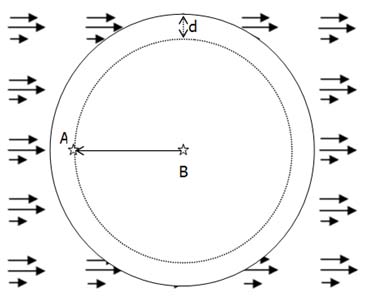 Obr. 18. Znázornění rozšířeného a usměrněného pole, do něhož je vložen ICRU sférický fantom (koule o průměru 30 cm tvořená tkáňově ekvivalentní látkou). Stanoví se dávkový ekvivalent v bodě A, který leží na poloměru proti směru pole v hloubce d pod povrchem koule. Číselná hodnota tohoto dávkového ekvivalentu v mSv odpovídá potom hodnotě prostorového dávkového ekvivalentu v referenčním bodě B