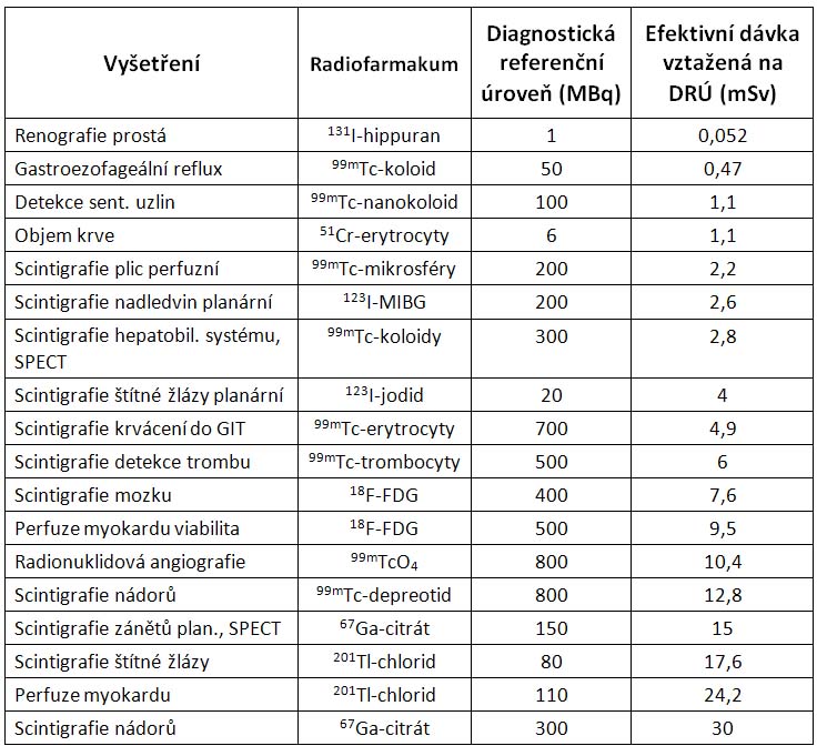 Aktivita radiofarmaka, která se aplikuje pacientovi při vyšetřeních v nukleární medicíně, musí být volena tak, aby zaručila dostatečnou diagnostickou informaci při co nejnižší radiační zátěži pacienta. Při volbě optimální aktivity aplikované dospělým se rovněž respektuje diagnostická referenční úroveň (DRÚ), což je hodnota aktivity platná pro pacienta o hmotnosti 70 kg, která by v rutinní klinické praxi neměla být překračována. Diagnostickou referenční úroveň je možné překročit u pacientů s hmotností větší než 70 kg a ojediněle i v případech, kdy je to zdůvodněno stavem pacienta (jiná onemocnění, komplikace apod.) a očekávaným diagnostickým přínosem. Optimální hodnota aktivity by měla být v rutinní klinické praxi nižší nebo maximálně rovná DRÚ. V podobě DRÚ bylo zavedeno vodítko k tomu, aby byla pacientům aplikována optimální aktivita a zároveň se tím omezil růst aktivit, radiační zátěže a s tím spojeného radiačního rizika stochastických účinků záření. Ze vstupních veličin změřených při vyšetření (radiodiagnostický postup) nebo před vyšetřením (postup v nukleární medicíně) se stanoví dávky v orgánech (zpravidla v nejvíce radiačně zatížených orgánech nebo orgánech s vysokou radiosenzitivitou) a na jejich základě riziko stochastického účinku v uvažovaném orgánu nebo na základě efektivní dávky celkové riziko těchto účinků. Na obr. 40 jsou uvedeny některé důležité údaje pro frekventovaná vyšetření v nukleární medicíně včetně DRÚ a k ní vztažených hodnot výsledné efektivní dávky.