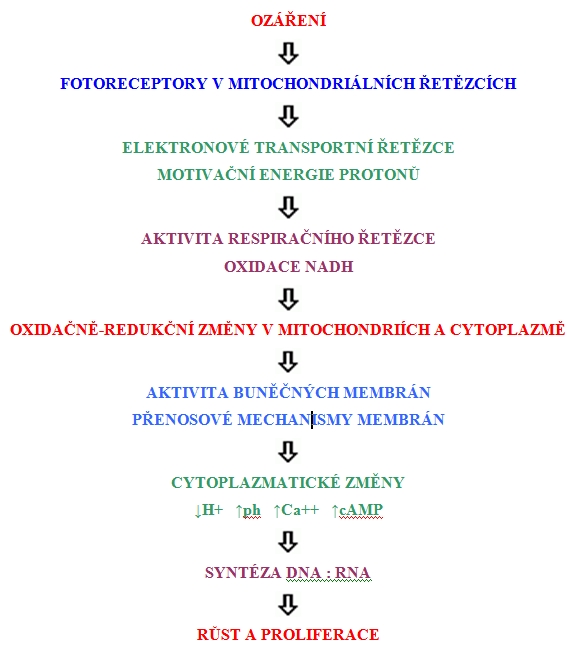 Fotochemické účinky laseruAbsorbovaná energie fotonů laserového záření může zasahovat do chemických procesů nejrůznějšími mechanizmy. Po transmisi paprsku tuto energii nejprve hodnotí buňka cílové tkáně a přenáší ji jako informaci na buňky jiné nebo od nitra buňky a dalšími mechanismy přenosu se dostává informace k mitochondriím, kde se dějí vlastní biochemické procesy. Fotochemické účinky laserového záření jsou založeny na principu absorpce jednotlivých fotonů, které vyvolávají biochemické pochody. Takovéto reakce mohou probíhat již při malých intenzitách.