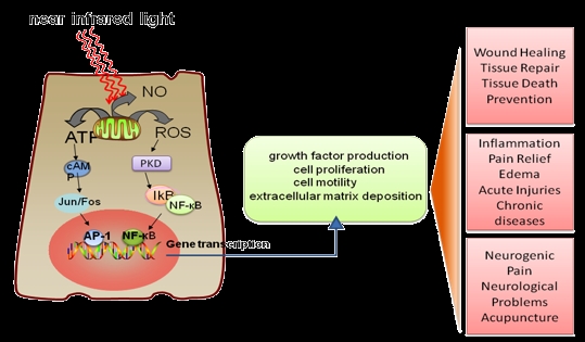 Účinek terapeutického laseru na celulární úrovniMechanismus biologických účinků nízkovýkonných laserů je ověřován in vitro i in vivo. Je popisován stimulační, protizánětlivý i analgetický efekt. Stimulační efekt aktivuje enzymy dýchacího řetězce (flavin dehydrogenázu, cytochromoxidázu) v mitochondriích. Enzymy se účastní oxidační reakce (přenos elektronu ze substrátů na kyslík), jejímž výsledkem je tvorba ATP. Zvýšená koncentrace ATP, ADP a AMP, při laserem navozeném stimulačním efektu, vede k replikaci mitochondriální DNA. Výsledkem je urychlená epitelizace postižené tkáně a stimulace tvorby kolagenu. Při protizánětlivém účinku nízkovýkonný laser aktivuje přirozené reparační procesy, kterými organismus reaguje na probíhající zánět. Zvyšuje se chemotaktická aktivita buněk (lymfocytů, monocytů, fibroblastů a polymorfonukleárních buněk), které se na protizánětlivé reakci organismu podílí.